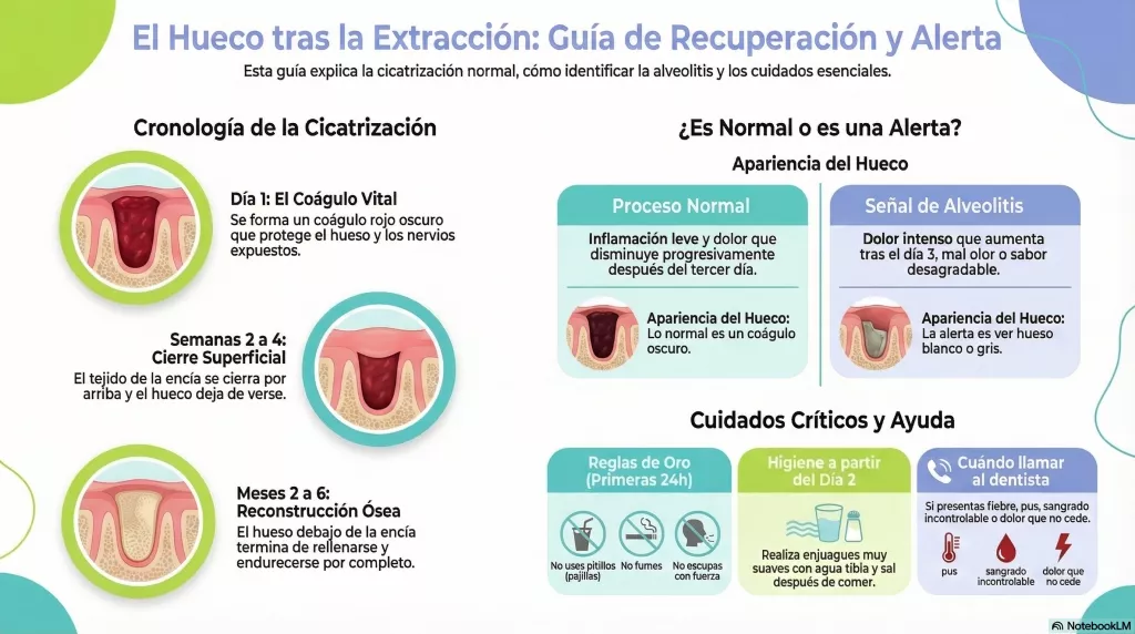 Muchos pacientes sienten el hueco con la lengua y se preocupan porque parece que no cierra, incluso cuando la cicatrización va perfectamente bien. Es normal que quede una pequeña depresión durante semanas. Lo que NO es normal es que el dolor aumente, que se vea hueso o que haya un mal olor después del cuarto día.